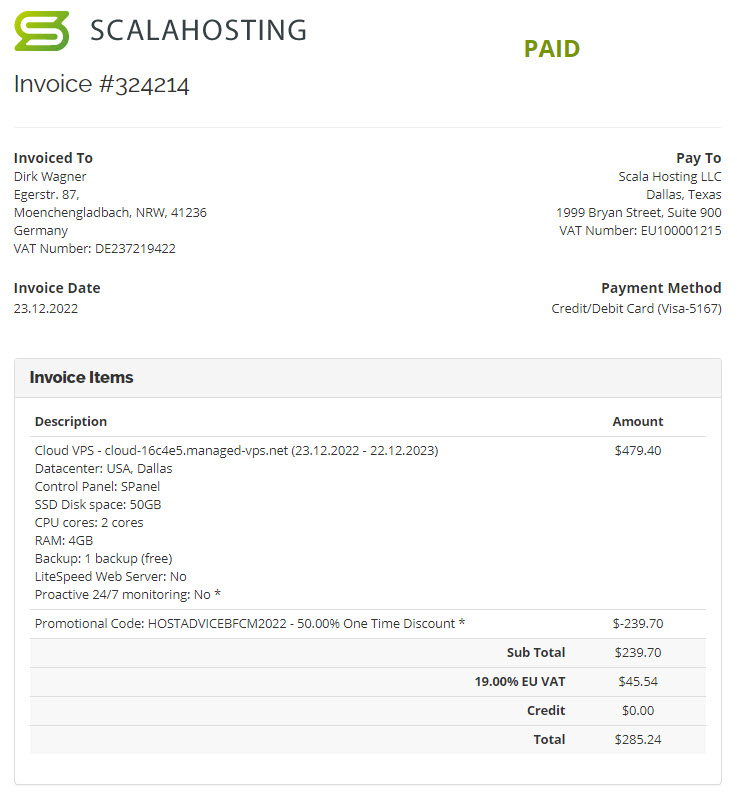 Proof of my Annual Payments for the Scalahosting VPS server (since 2015)